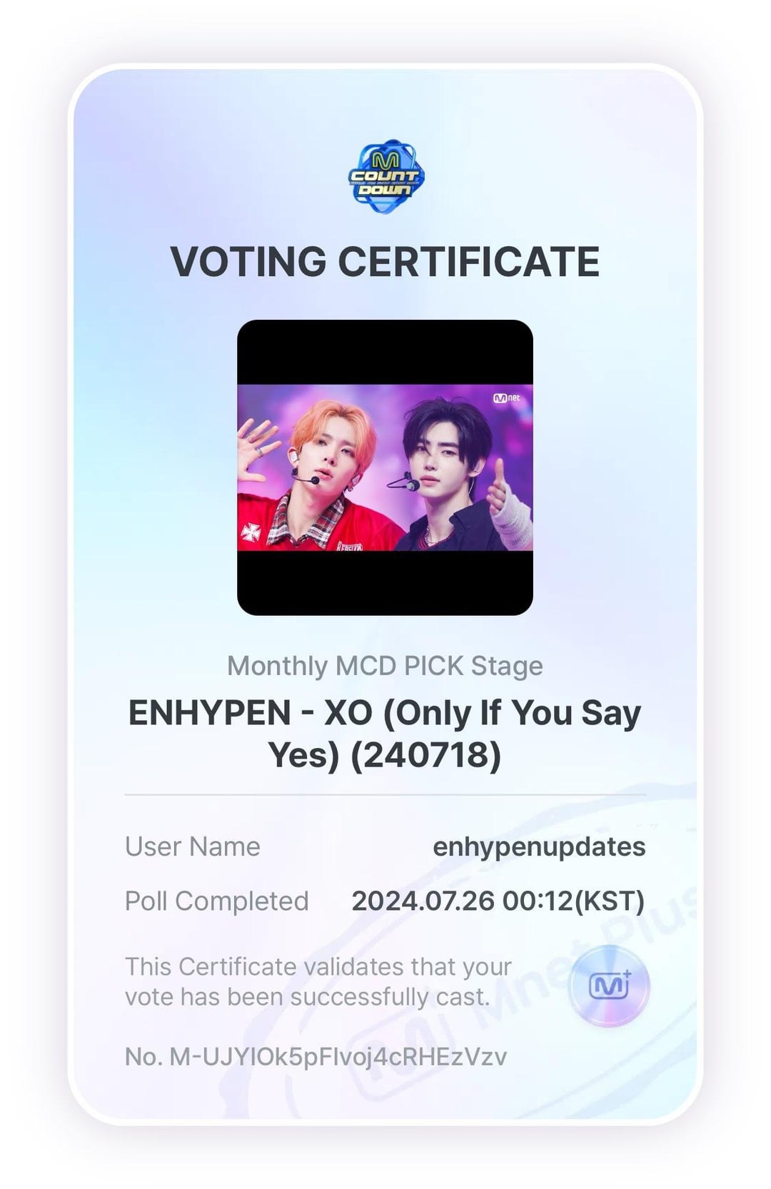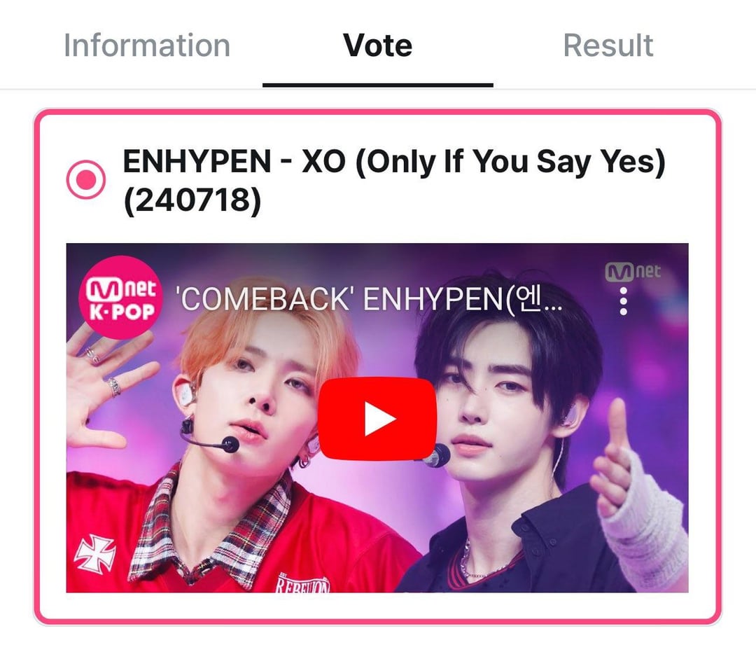 ENGENEs! ENHYPEN's 'XO (Only If You Say Yes)' is nominated on M Countdown's 'Monthly MCD PICK Stage'. Vote daily on every device on the Mnet Plus app.