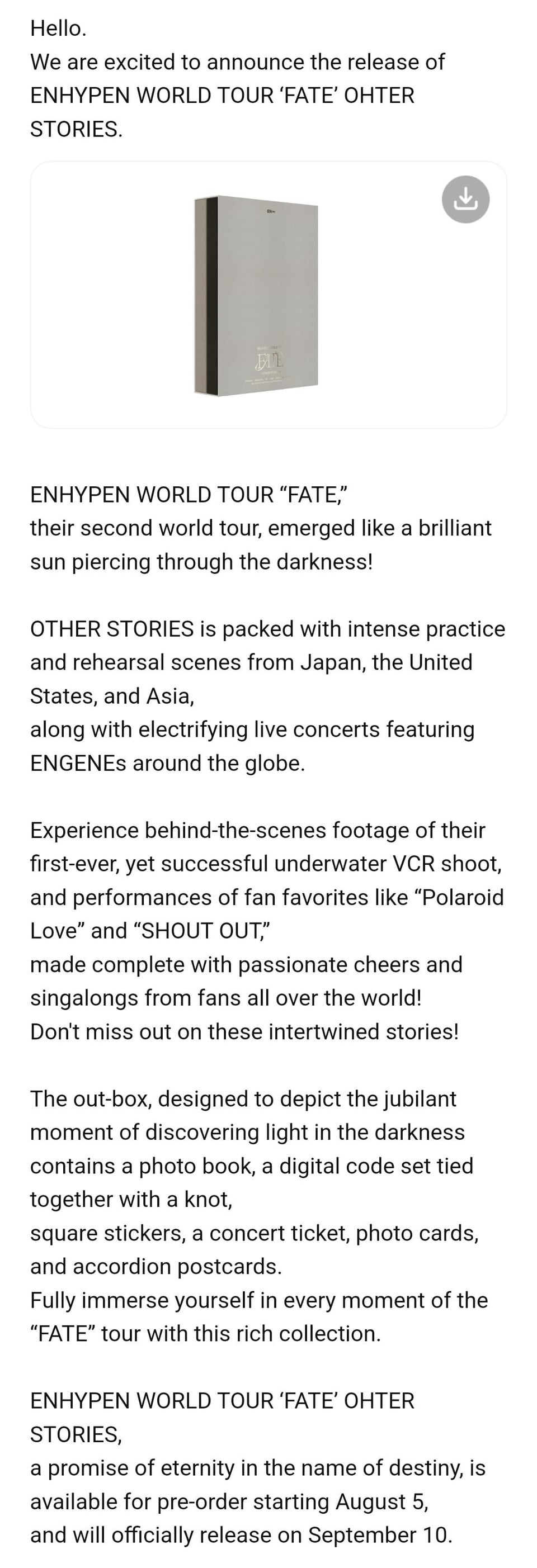 [RELEASE DATE] – Weverse Shop GLOBAL: Friday, August 23, 2024 (KST) – Weverse Shop US: Tuesday, September 10, 2024 (PDT) – Weverse Shop JAPAN & UNIVERSAL MUSIC JAPAN: Wednesday, August 28, 2024 (KST) – QQ Music / Kugou Music : Expected to be released in September 2024 (KST)