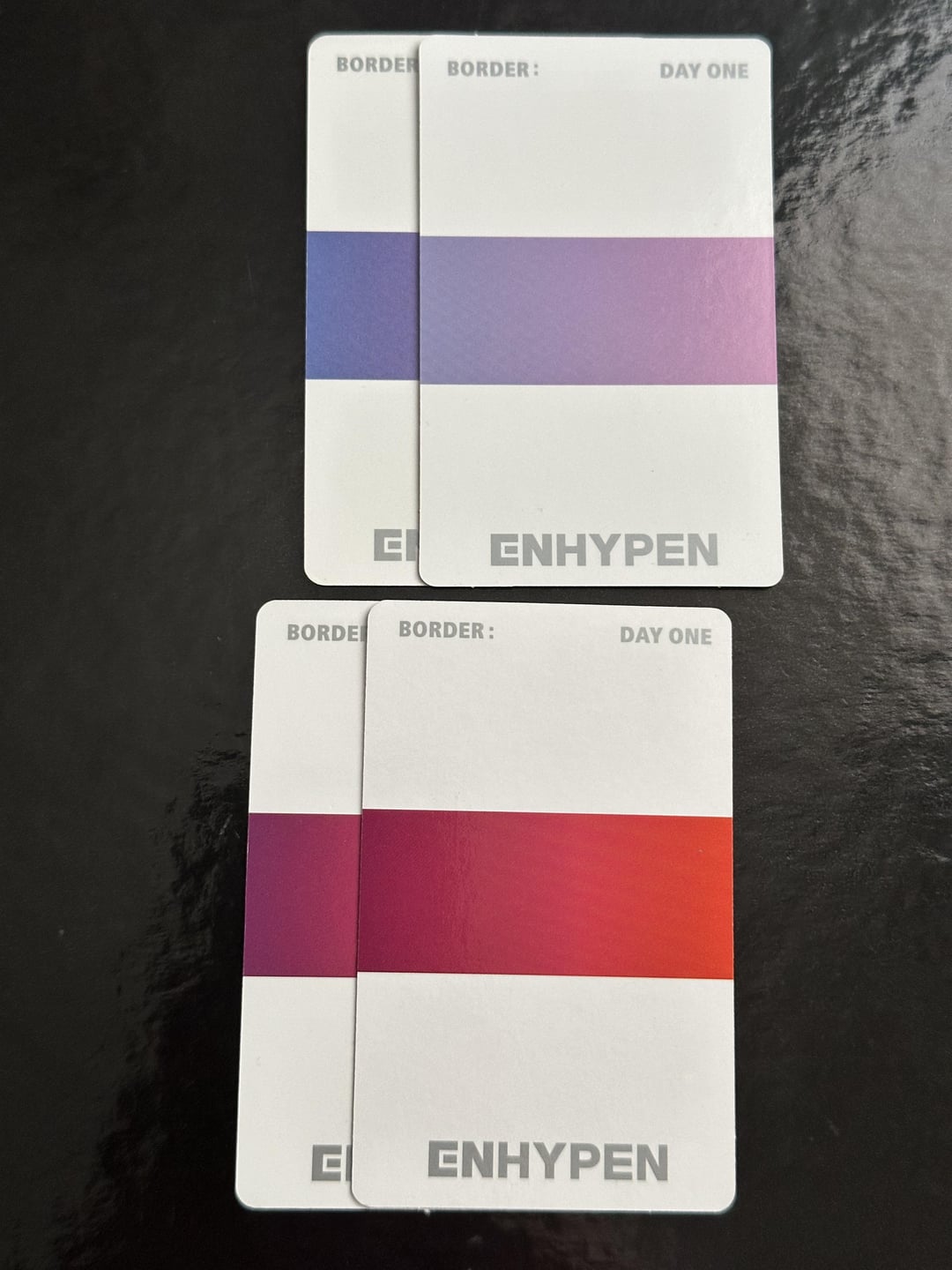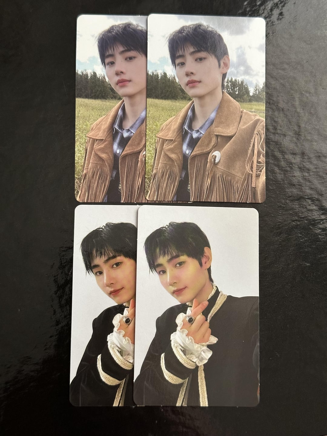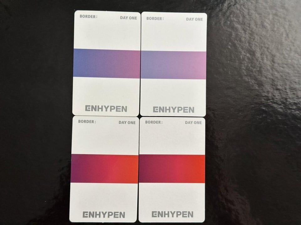 Could anyone who has these Sunghoon photocards from border day one dawn and dusk, contact me? It would be perfect if you pulled them yourself since it would be the most authentic confirmation. I just want to make sure they’re official and not rip offs before I trade the doubles since their colors differ. Top right Hoon also has slightly different corners and words are lower 🥲
