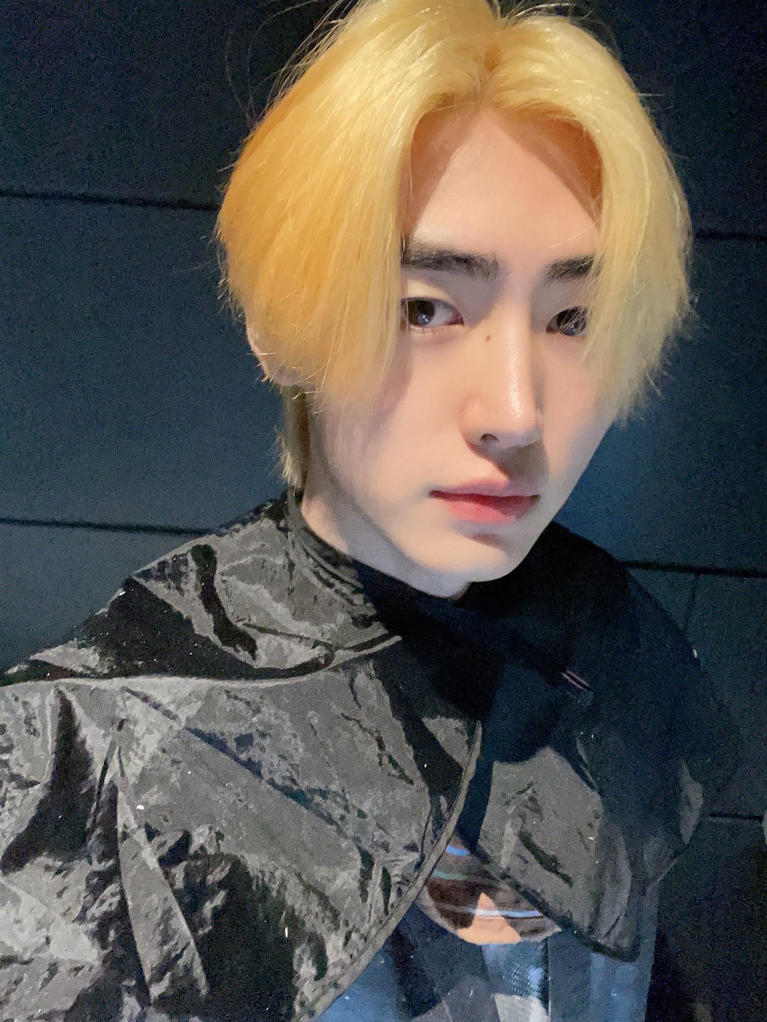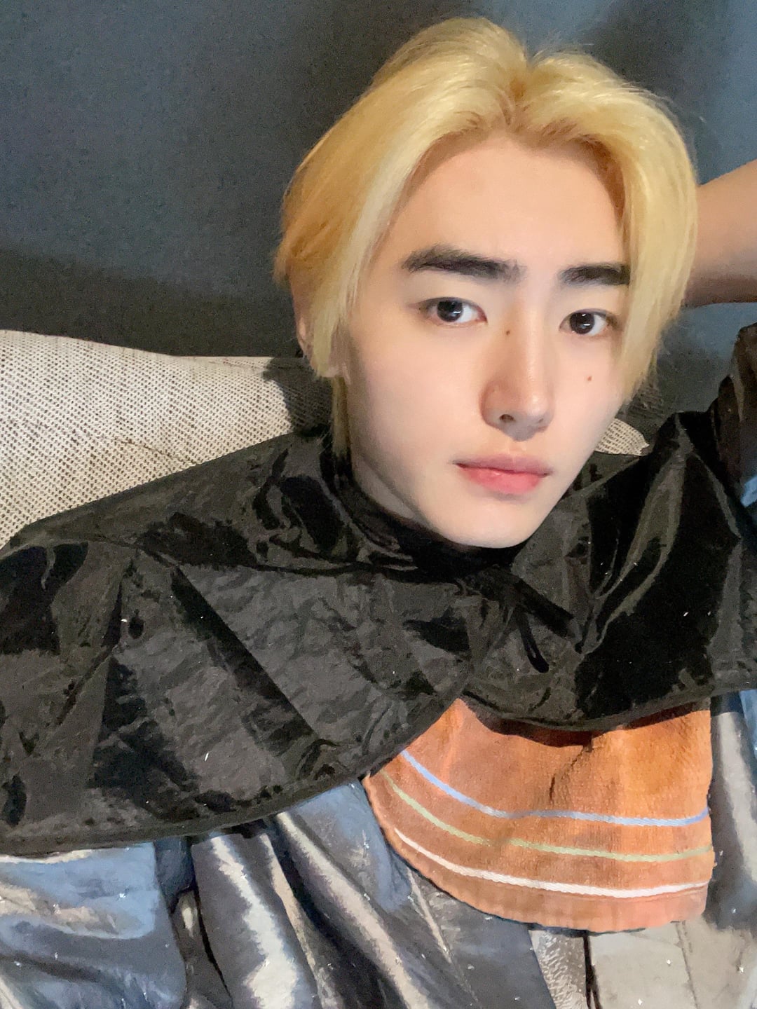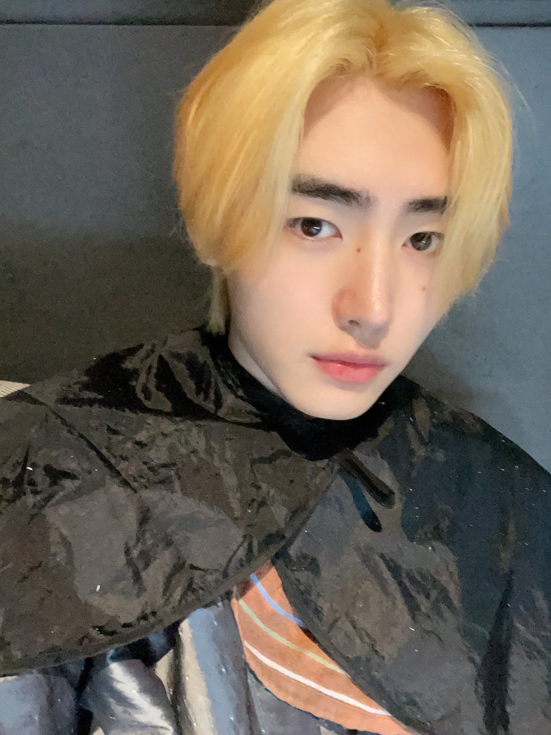 Guys breathe and read the pinned comment 😭 He took a pic when his hair was in the middle of recoloring, this is clearly a partial step before it gets toned/colored. This was taken before the Seoul concert, he still has black hair for now.