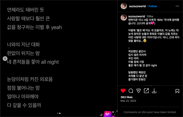 She now has a separate public ig account dedicated to her works as a lyricist, but she no longer seems to add which specific lyrics she wrote. She seems to be very open about her writing ventures and seems to readily promote this avenue of her work whenever and wherever she can, so I have left the username for her main account visible.