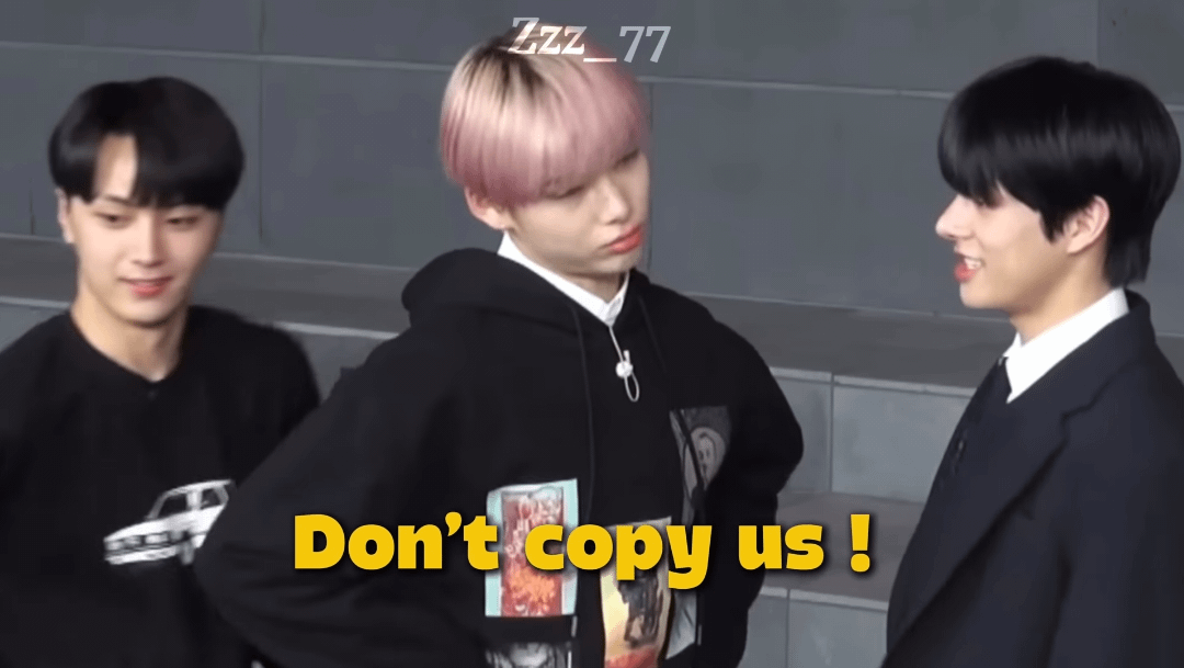 The second clip (second image) is from an EN-O'CLOCK video i cannot find where the members were split into two teams and one of them was mocking the other, with Ni-ki responding in a very sassy attitude. Found it in this video with the maknae line of Enhypen at 5:42 .