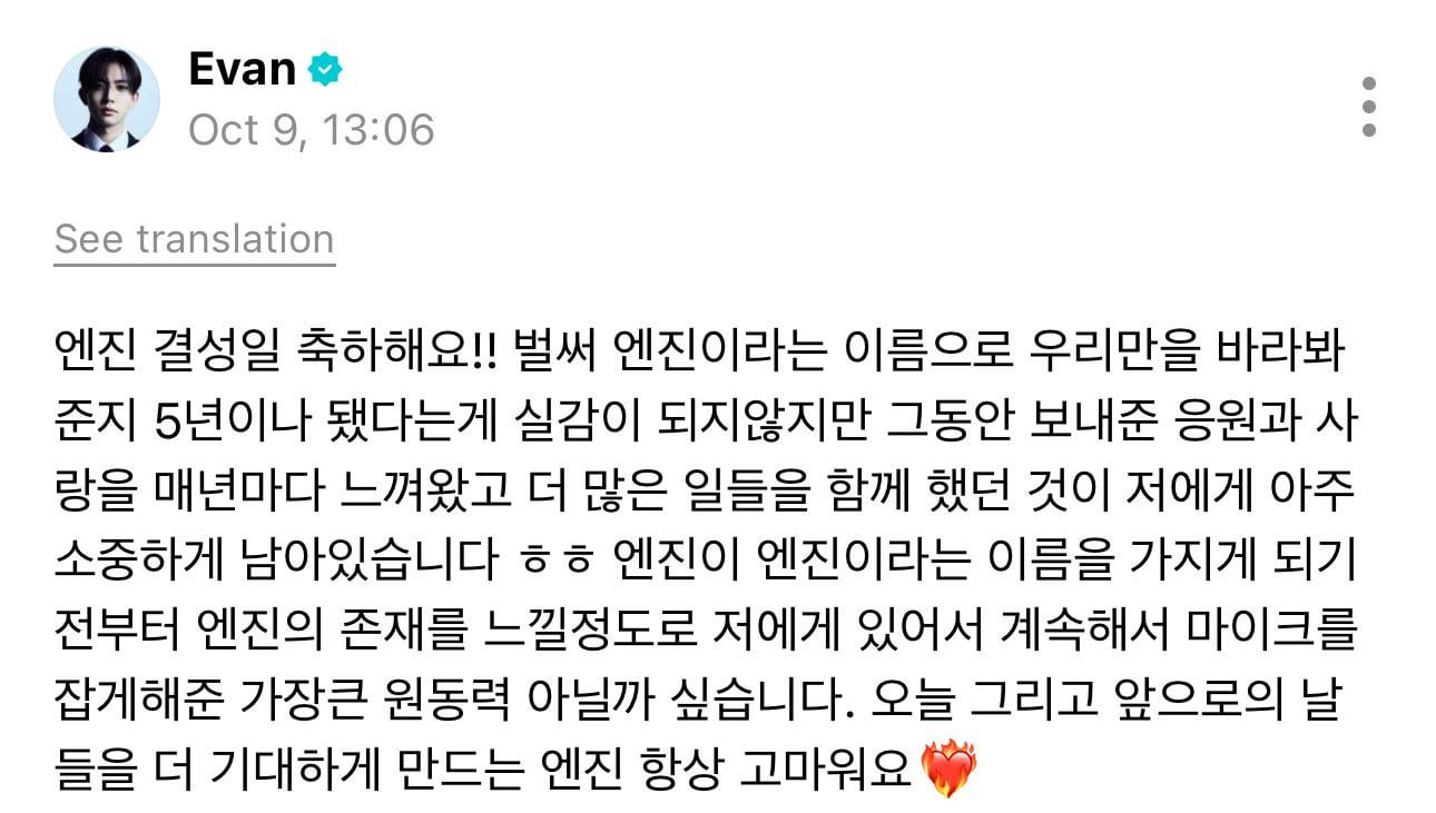 Happy anniversary, ENGENE! It still doesnโt feel real that itโs already been five years since you began looking only at us under the name ENGENE, but Iโve felt all the love and support youโve given every single year, and all the things weโve done together have remained so precious to me. hehe. I think ENGENE has been my greatest driving force, even before you had the name ENGENE, I could already feel your presence, and thatโs whatโs kept me holding the mic until now. Thank you always, ENGENE, for making me look forward to today and all the days to come. โค๏ธโ๐ฅ