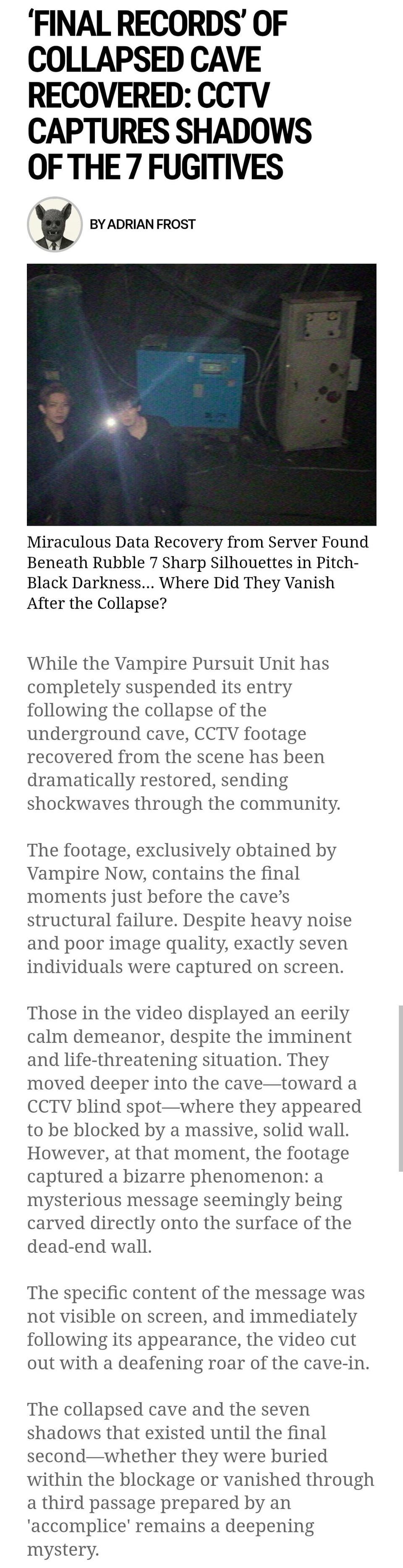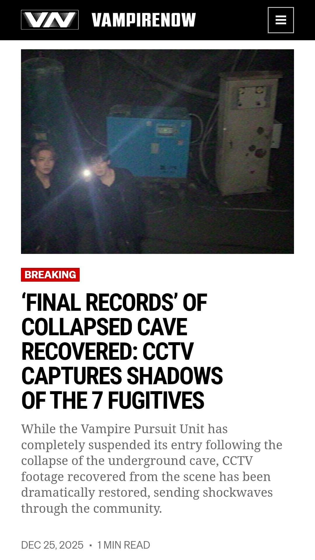 December 24, 2025 share📍Vampirenow.live web:Search at Collapsed Cave Continues: “Third Party Involved?” vs. “Investigation Leak?”‘Final Records’ of Collapsed Cave Recovered: CCTV Captures Shadows of the 7 Fugitives