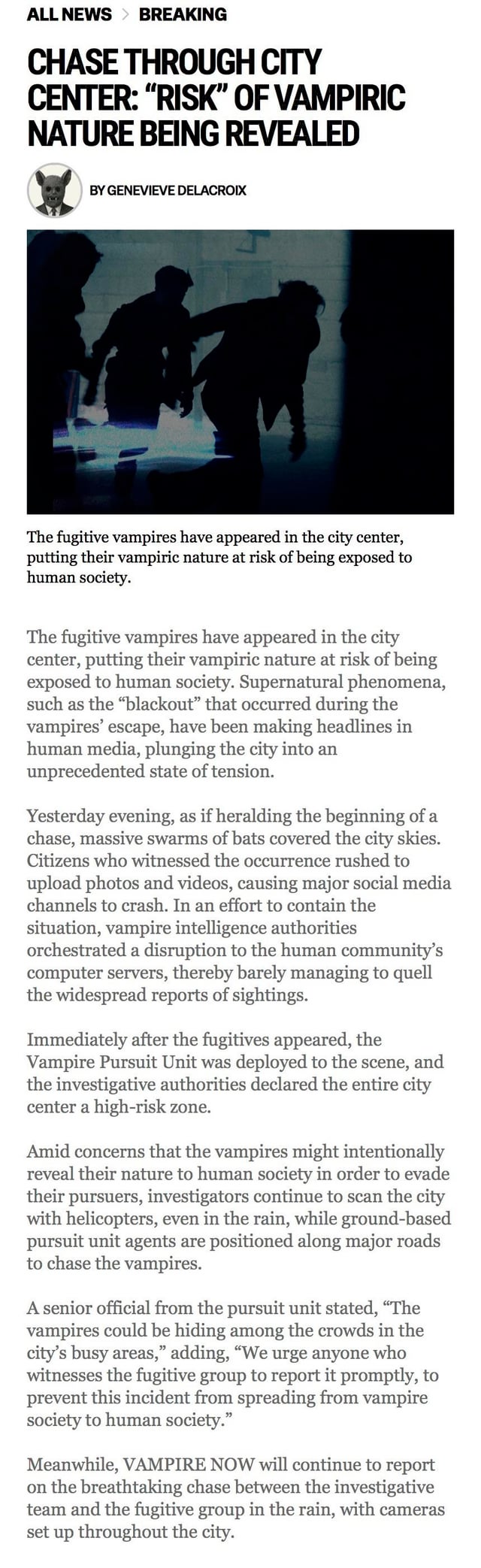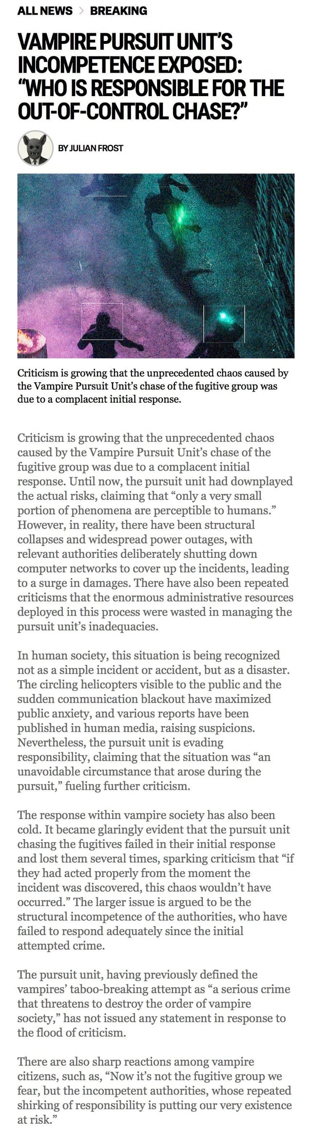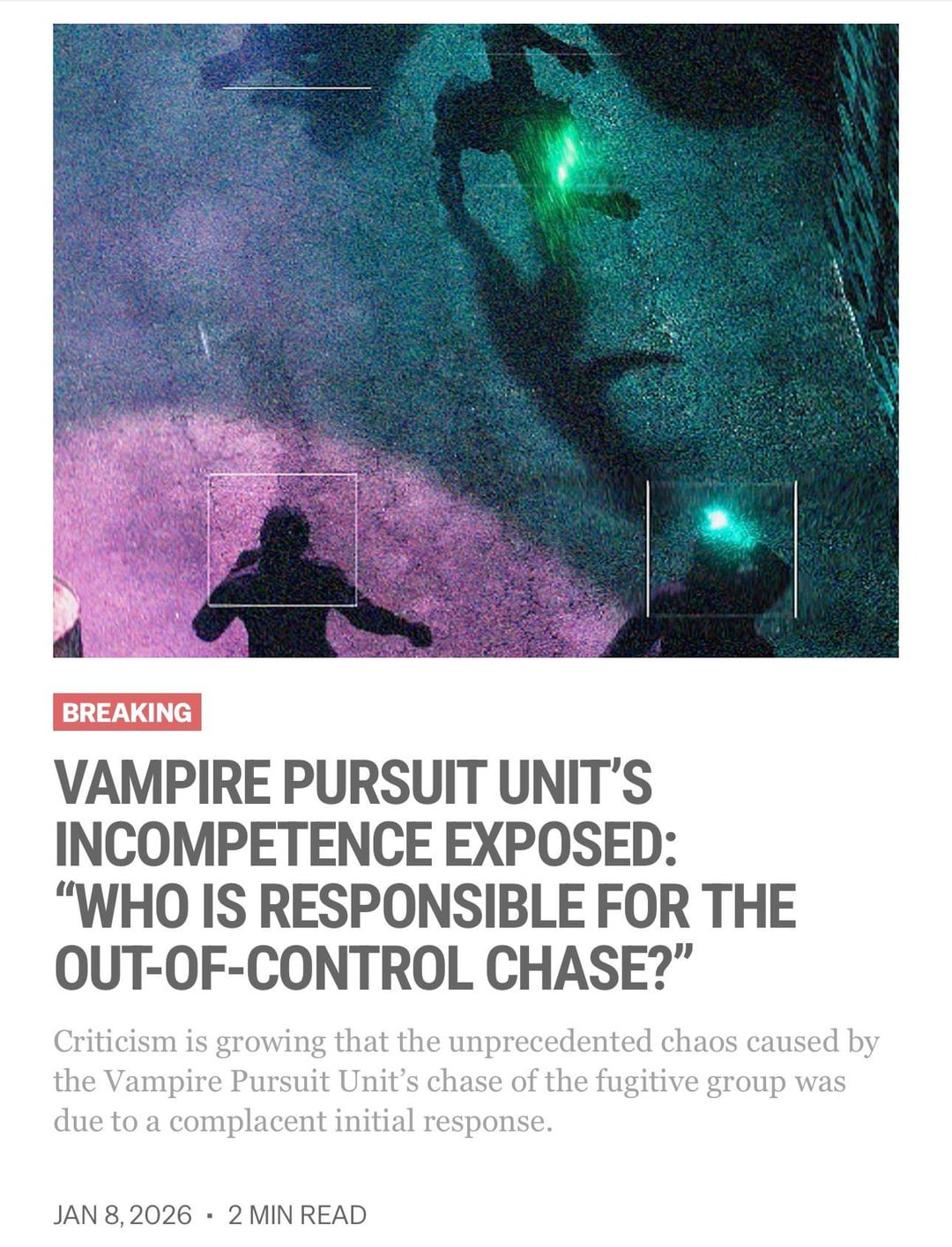 January 8, 2026 share📍 GREEN LASERS SHAKE CITY SKYLINE: VAMPIRES SPOTTED IN CITY CENTER AFTER BLACKOUT📍 CHASE THROUGH CITY CENTER: “RISK” OF VAMPIRIC NATURE BEING REVEALED📍 VAMPIRE PURSUIT UNIT’S INCOMPETENCE EXPOSED: “WHO IS RESPONSIBLE FOR THE OUT-OF-CONTROL CHASE?”