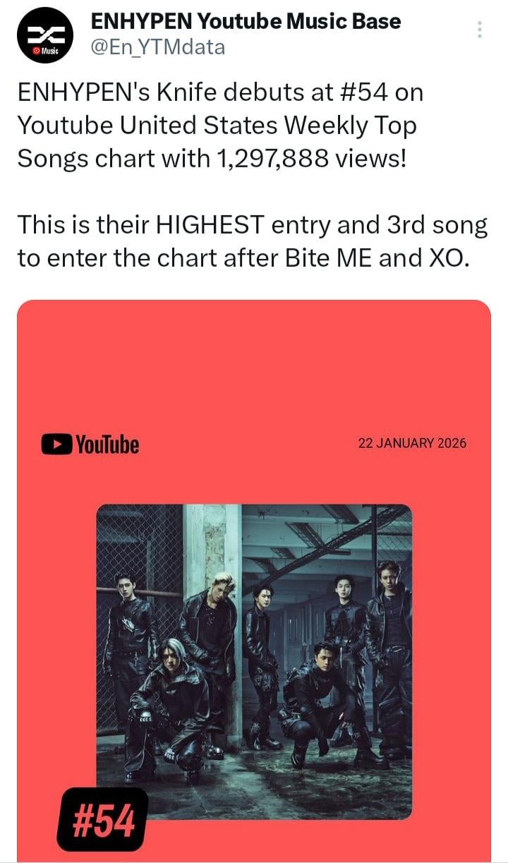 (26/01/25) ENHYPEN's Knife debuts at #54 on Youtube United States Weekly Top Songs chart with 1,297,888 views!