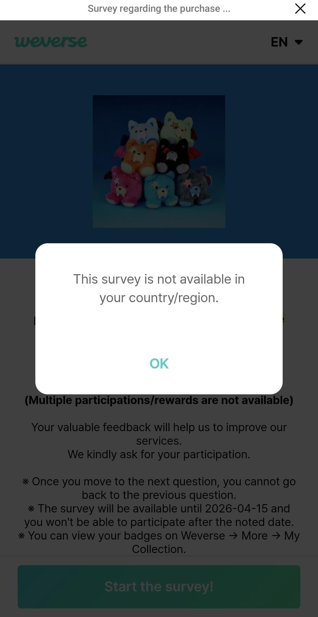 ordered the vampire voice keychain and having the worst luck! got the one i didnt want as much as any other haha π but I love the colour so im keeping it π and then i went to get my "badge" from weverse after completing survey and it isn't available for me does anyone know why the UK might be excluded?