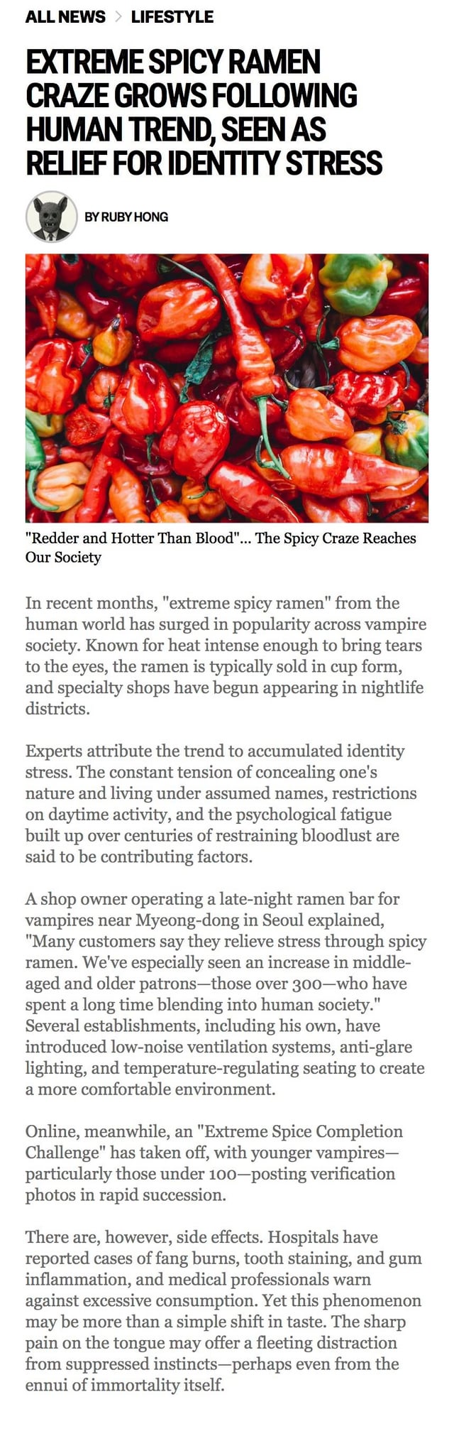February 26, 2026 shareπ EXTREME SPICY RAMEN CRAZE GROWS FOLLOWING HUMAN TREND, SEEN AS RELIEF FOR IDENTITY STRESS
