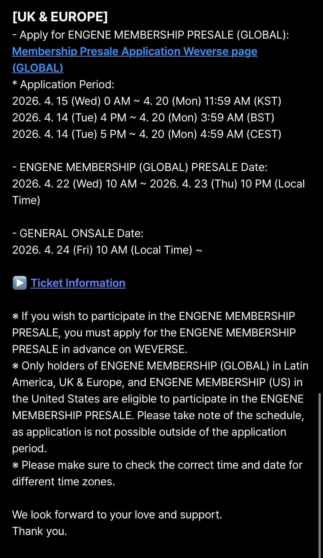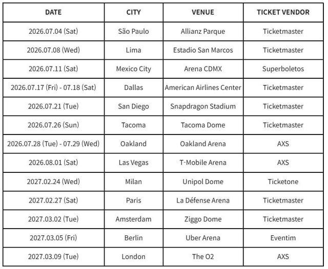 It’s way too early to be selling the tickets for Europe I swear ๐ญ The london concert is 9.3.27 and they’re selling tickets 24.4.26? Last year for the Manchester concert they sold tickets in April and the concert was in August. Also is there more dates to come.? I feel a bit sad that there’s only one UK concert but I also don’t want them to be overworked