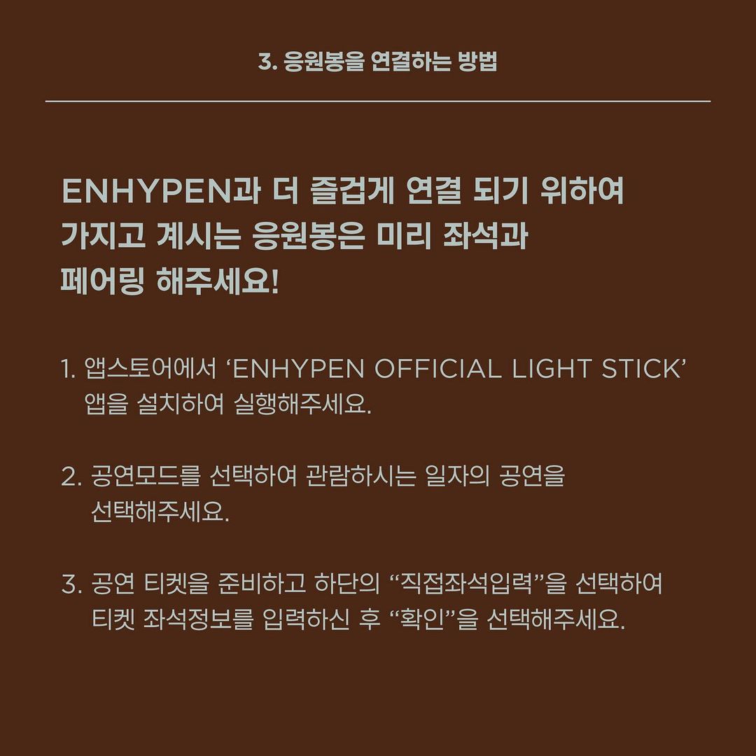 February 4, 2021 shareHow to CONNECT ENHYPEN and ENGENE – OFFLINE 3. 응원봉을 연결하는 방법 자세히 확인하기 : 인터파크 티켓에서 2021 ENHYEPN FANMEETING 를 검색해주세요!